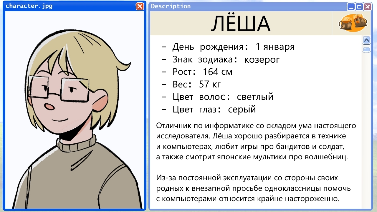 Привет! Для меня лично это одна из самых хороших коротких новелл. Здесь и драма, комедия, геймплей, да ещё и бесплатно! Разработчикам уважение за это и спасибо за пасхалочки) Видео прохождение на канале: